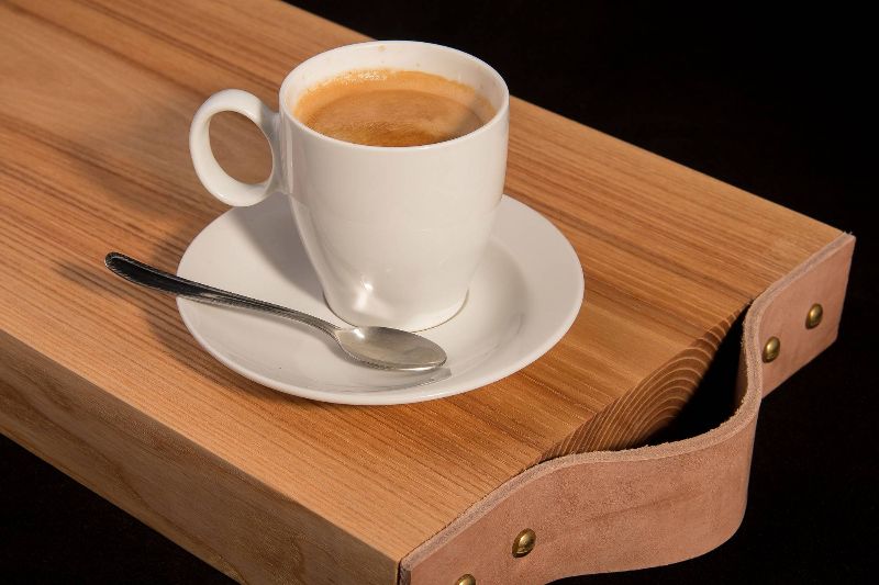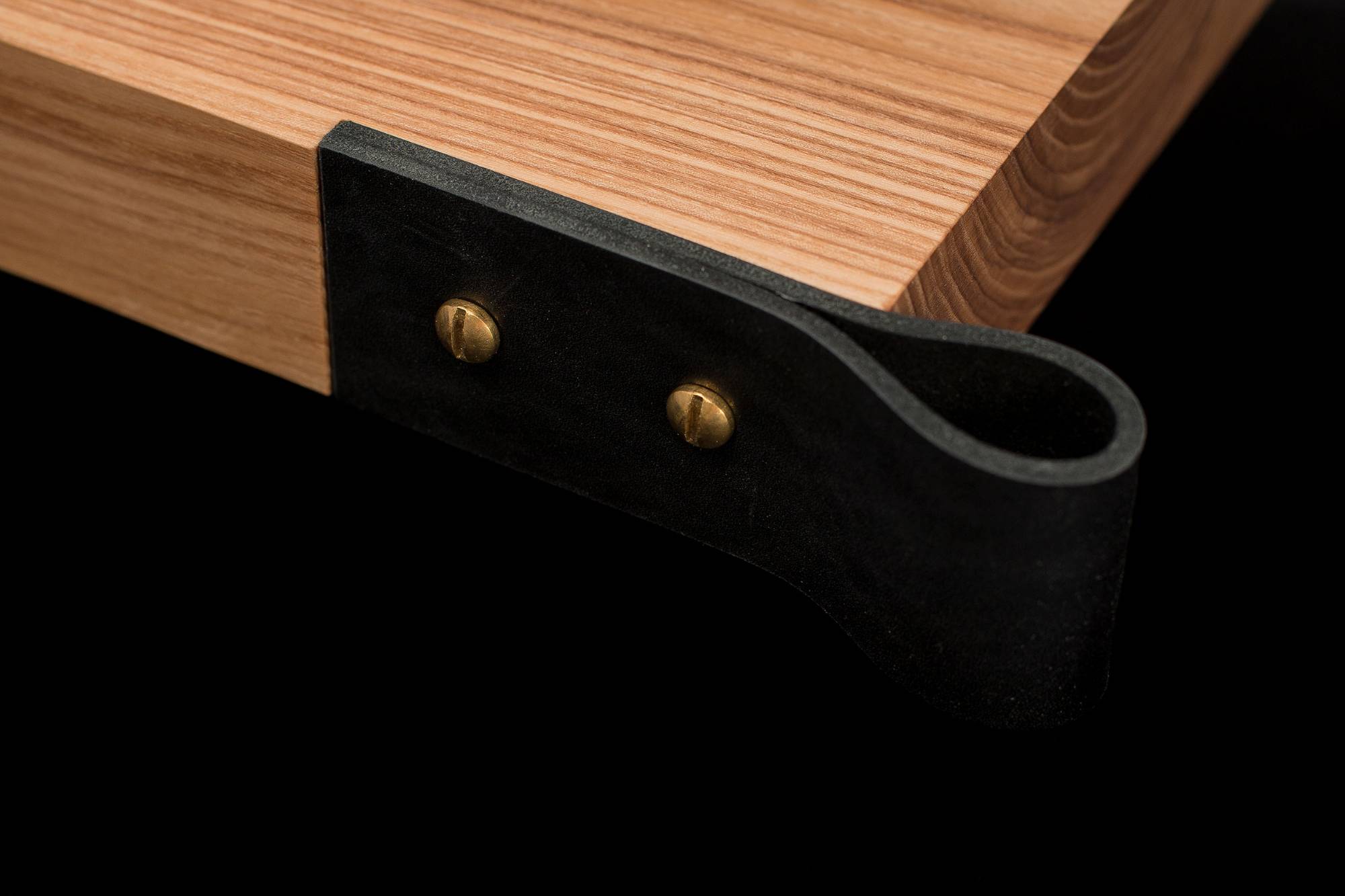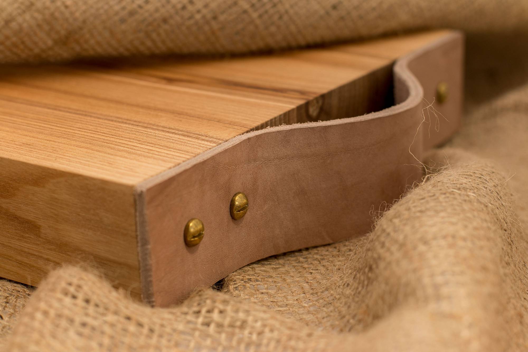 Oak or ash tree cutting board with leather handle on corner. Can be used in kitchen or serving morning cofee in bed. Very durable but take care of leather handle.