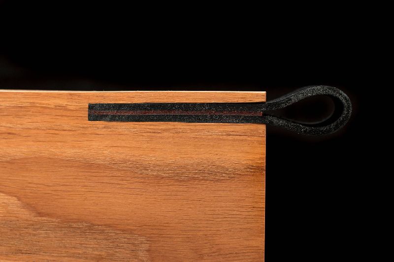 Those boards have leather handle mooved inside the board. It will withstand any knife or meat hammer, as it will be nice stand for wine glass in sofa. Just keep leather handle dry.